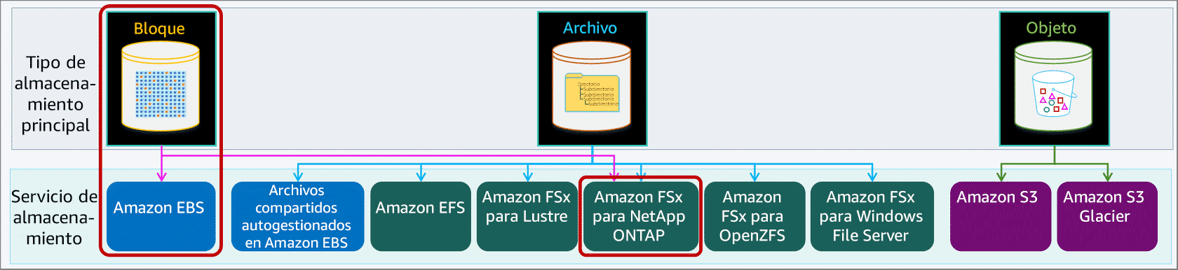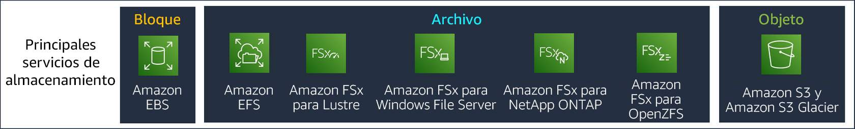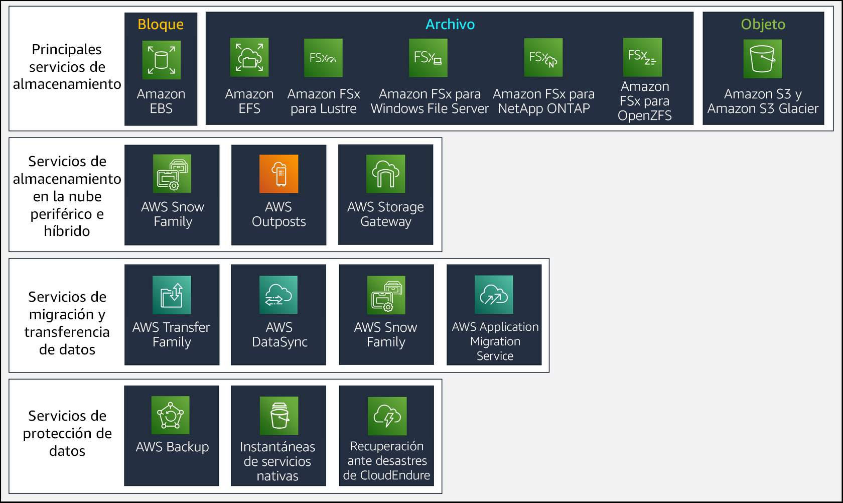 Amazon Web Services (AWS) cuenta con varios recursos de almacenamiento para satisfacer sus necesidades.