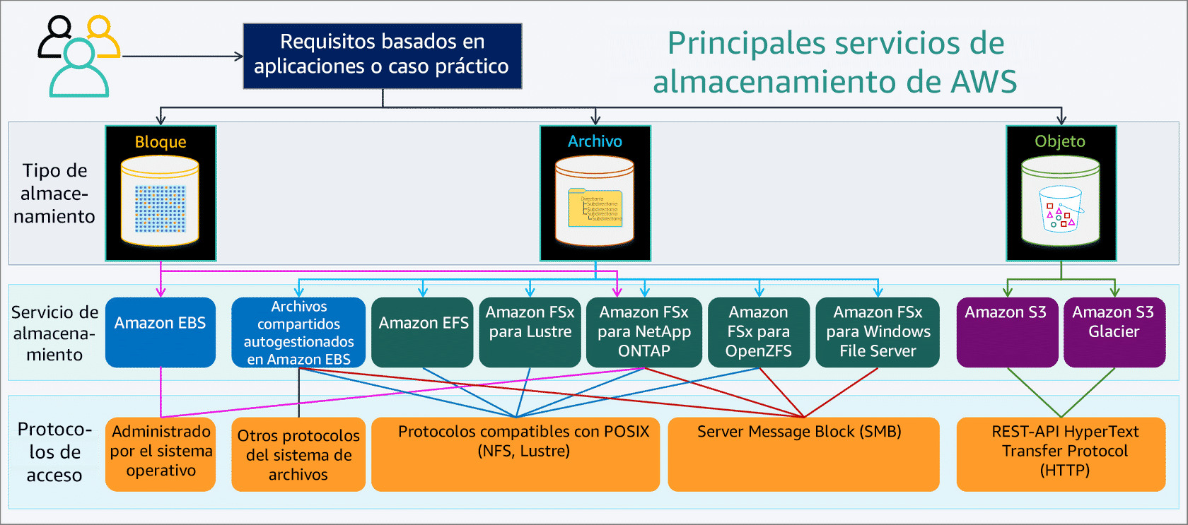 ¿Cómo puede AWS cumplir con los requisitos de almacenamiento de objetos, en bloques y de archivos?