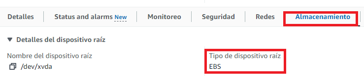 - En la consola de Amazon EC2, abra el panel Instancias y seleccione una instancia. El Tipo de dispositivo raíz aparece en la pestaña Almacenamiento, en Detalles del dispositivo raíz.