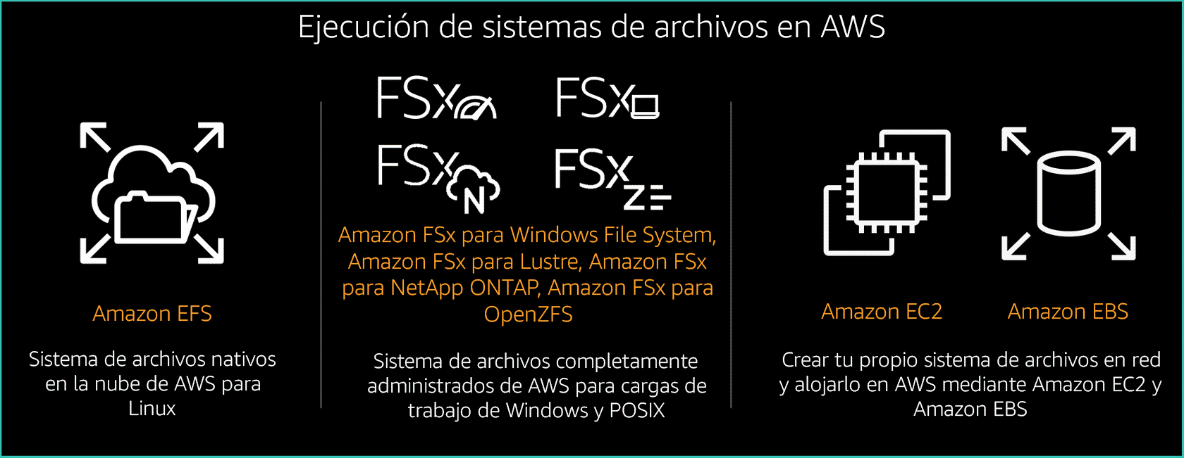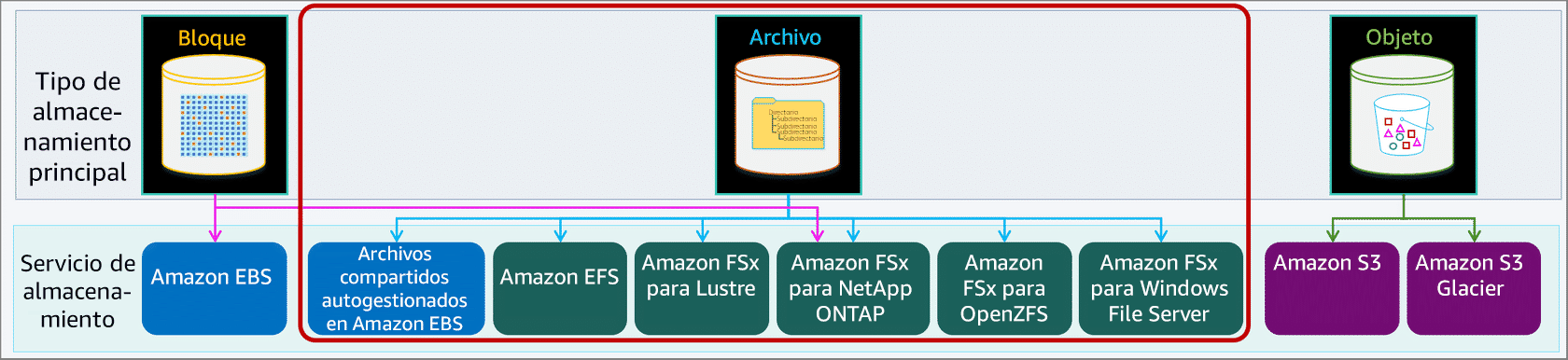 Actualmente, AWS ofrece tres servicios diferentes de almacenamiento de archivos administrados para satisfacer los requisitos de tus aplicaciones, flujos de trabajo y casos prácticos. Además, puedes utilizar Amazon EBS para crear sistemas de archivos autogestionados.
