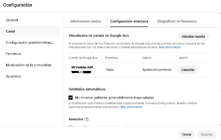 El lunes 9 de diciembre 2024 vincule mi cuenta de Google Ads a Youtube y esta en estado pendiente
