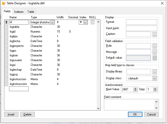 Ahora el ancho de logtabla, logusuario, logproyecto, Logpc=logpcp, son de de ancho sugerido, pueden ampliar al ancho que desean tanto en la tabla “clientes” como en la “tablalog” y no necesariamente logpc de “clientes” deba user igual logpc de “logtabla”