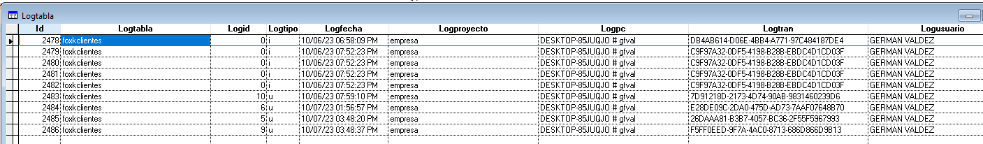 En este ejemplo la tabla usuarios el campo Nombre contiene el registro Germam Valdez que se grabara en la tabla logtabla en el campo logusuario